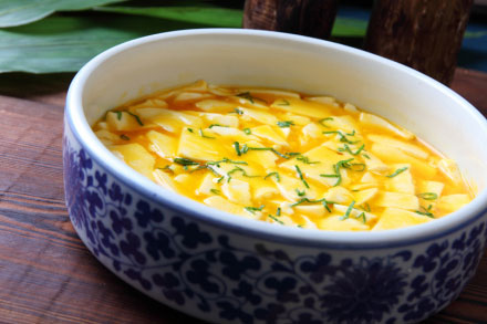 蝦黃豆腐選用地產(chǎn)小龍蝦黃烹制而成,入口鮮香四溢,此菜經(jīng)久不衰,為。榮獲江蘇名菜稱號。蝦黃豆腐