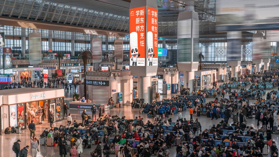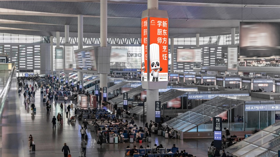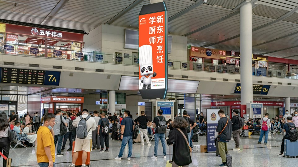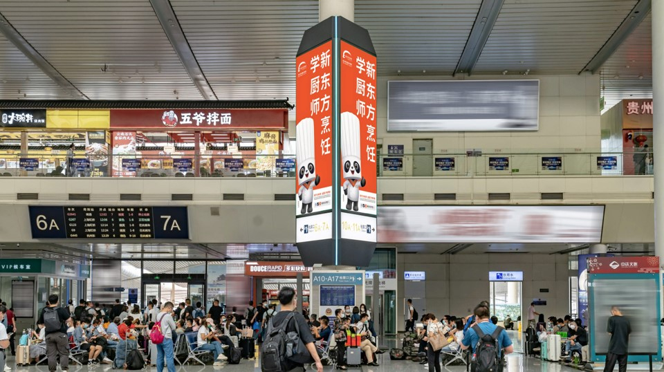 新東方烹飪教育此次在北京南站、上海虹橋站、廣州南站、鄭州東站、濟南西站成都東站、南京南站等國內(nèi)核心高鐵樞紐的廣告投放,以極具視覺沖擊力的IP形象在各個城市站點顯眼、人流集中的區(qū)域?qū)崿F(xiàn)了覆蓋,包括在進站口、檢票口、候車廳、往來通道等位置,以LED超級大屏的形式成為來往旅客繞不開的視覺焦點。